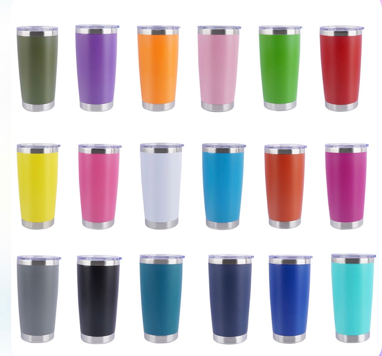 These stainless steel, vacuum insulated tumblers are awesome for hot or cold beverages. Each tumbler includes a sliding lid with opening and plastic straw.